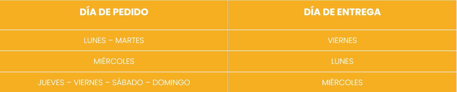 El pedido lo recibirás el día que elijas según la tabla adjunta, en un horario que concertaremos de forma mutua. La empresa de transporte que hará la entrega del pedido, garantiza en todo momento la cadena de frio necesaria para su conservación, por lo que recomendamos que una vez recibido el producto, lo coloque en su frigorífico.
