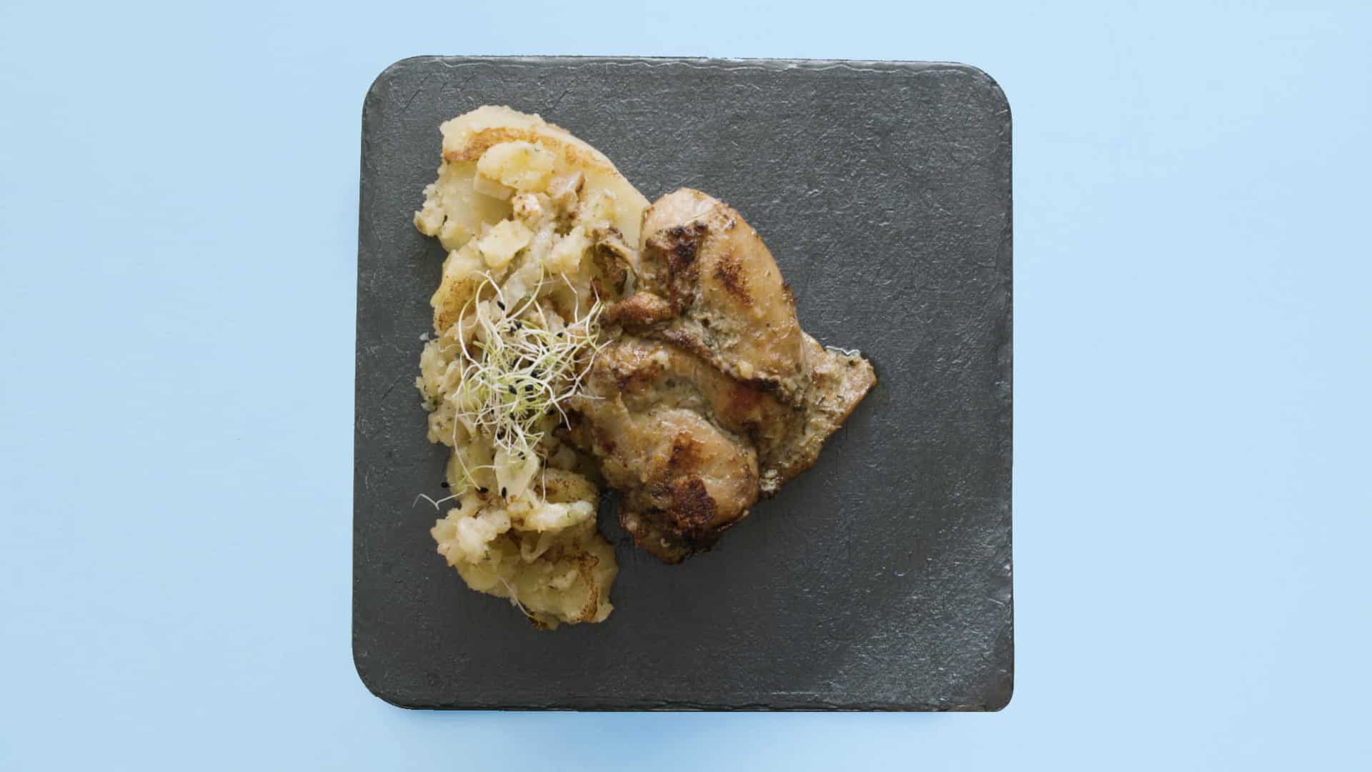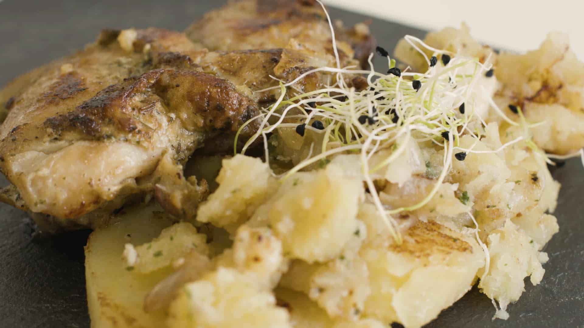 Churrasco Pollo, Perejil, Ajo, Vino Blanco, Orégano, Pimienta Negra, Hierbas Provenzales, Patatas, Comino, Caldo de Pollo, Aceite de Oliva Virgen Extra, Sal, Jengibre, Cebolla