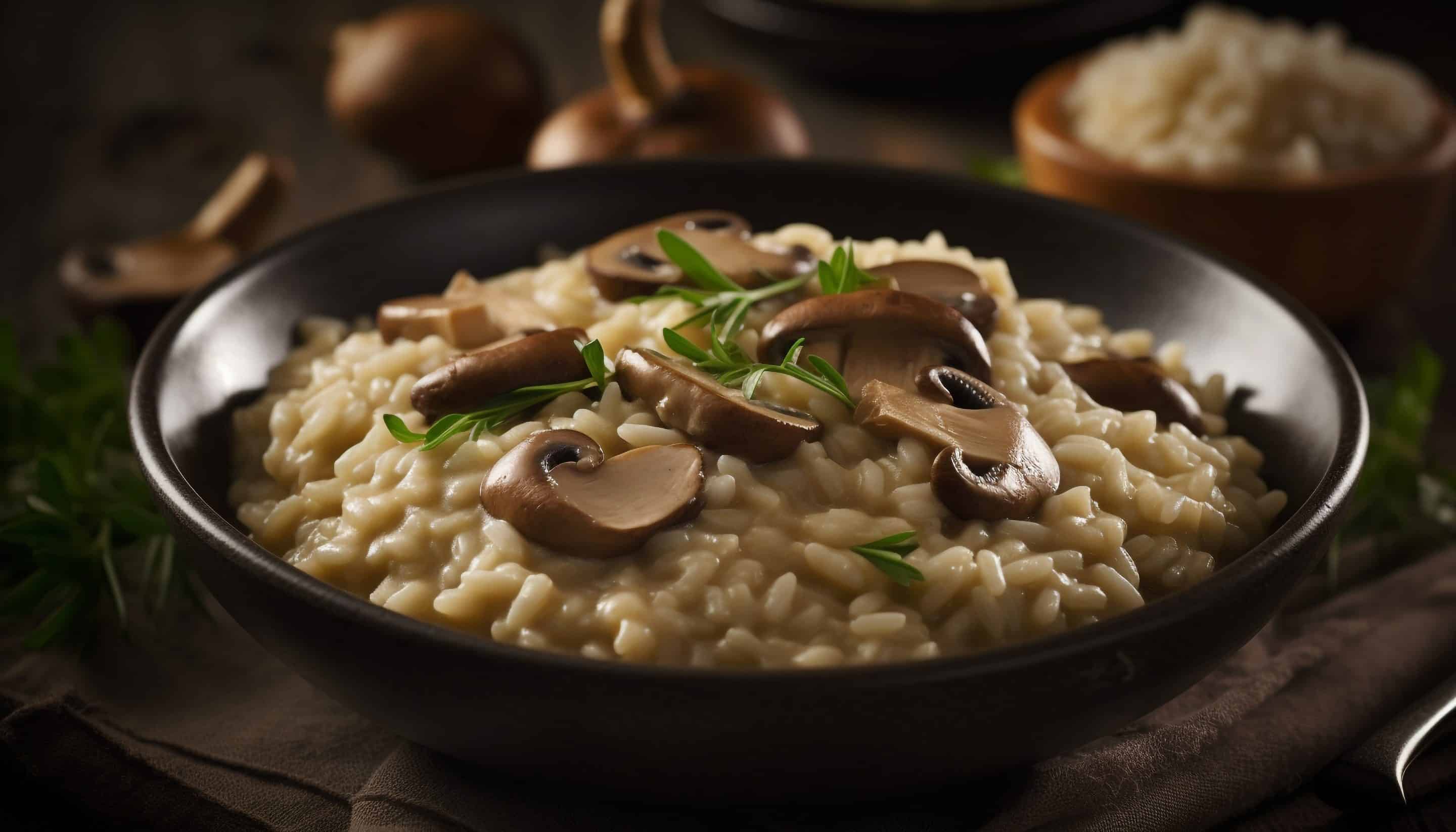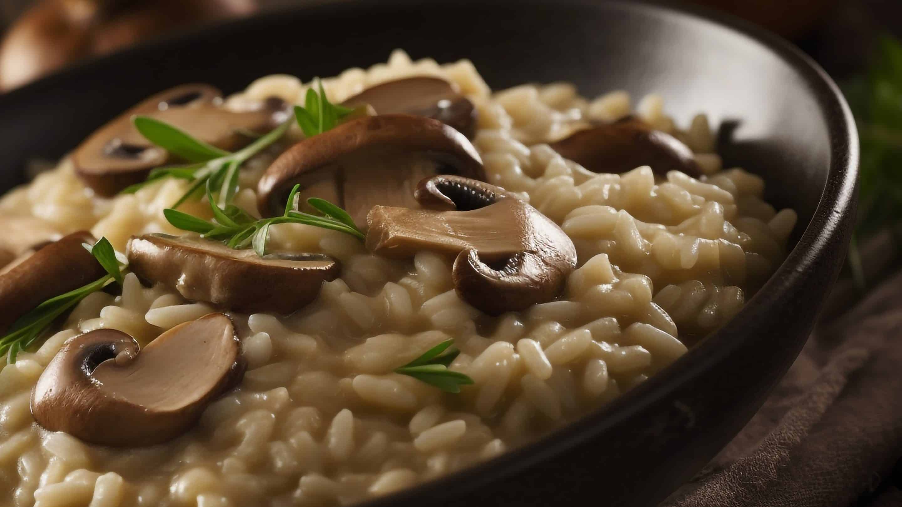 Arroz Redondo, Setas Variadas, Caldo Vegetal, Mantequilla, Nata Vegetal, Vino Blanco, Cebolla, Pimienta Negra, Pollo, Ajo, Queso Parmesano, Sal